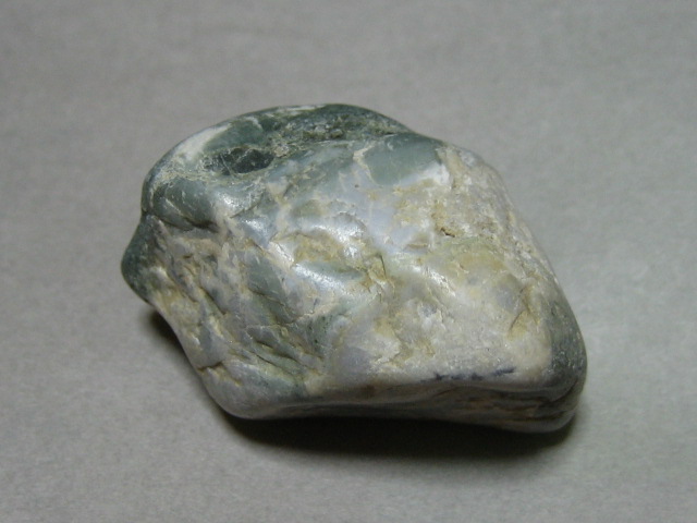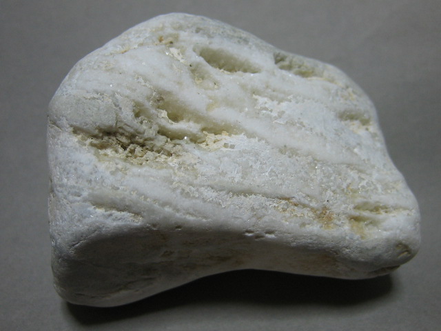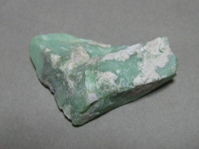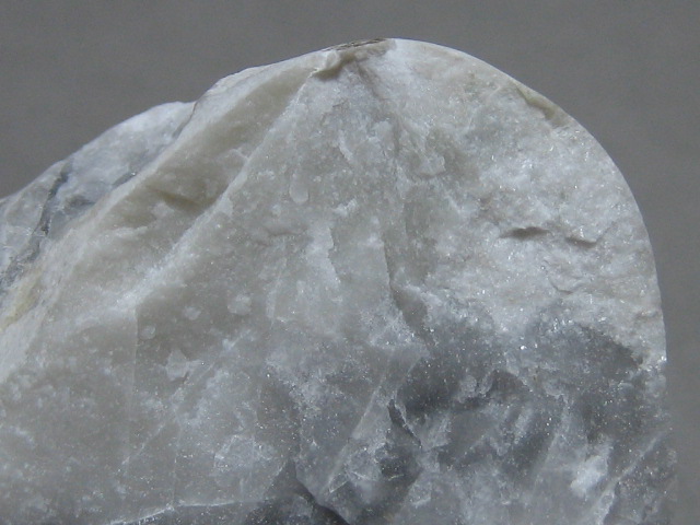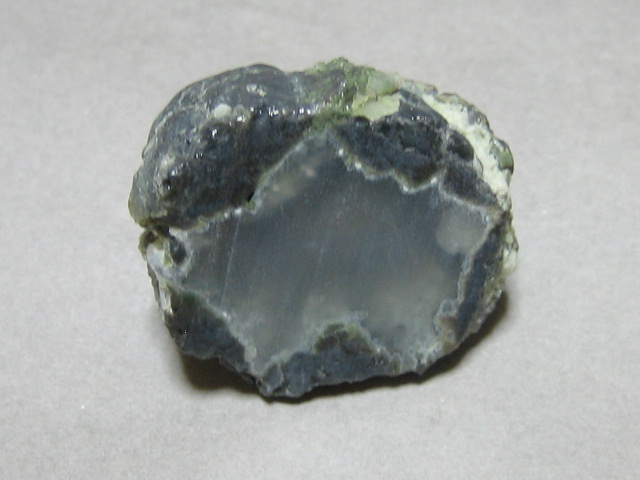 このロディン岩の表面には針状結晶のソーダ沸石が沢山付いています。ロディン岩は透輝石、単斜灰簾石、ぶどう石、(ベスブ石)などのカルシウムを含む鉱物から成り立っているので、ナトリウムを含むソーダ沸石が見られることが奇異に感じられたのですが、副成分としてソーダ沸石が含まれることもあるようです。