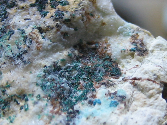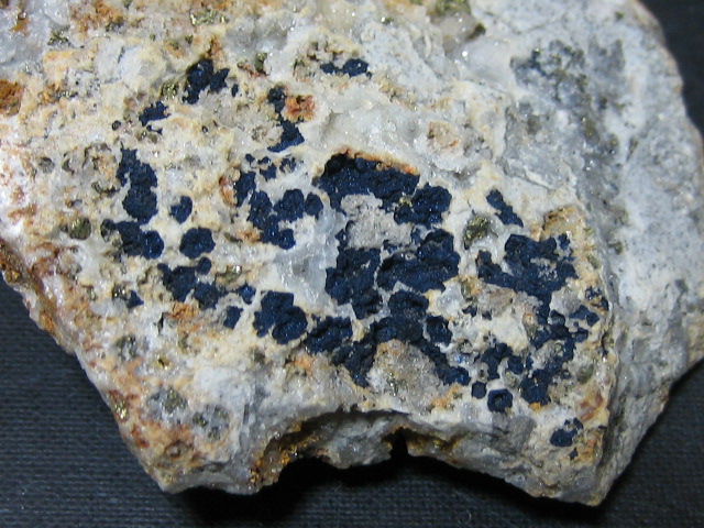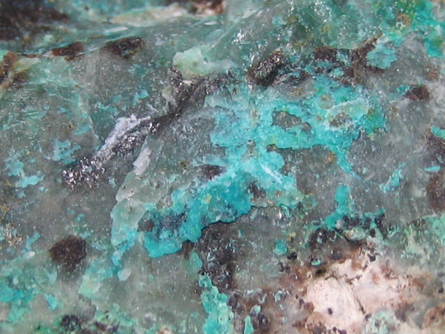 金属光沢を有する塊状の四面銅鉱の他に、一面に青色の珪孔雀石が見られます。