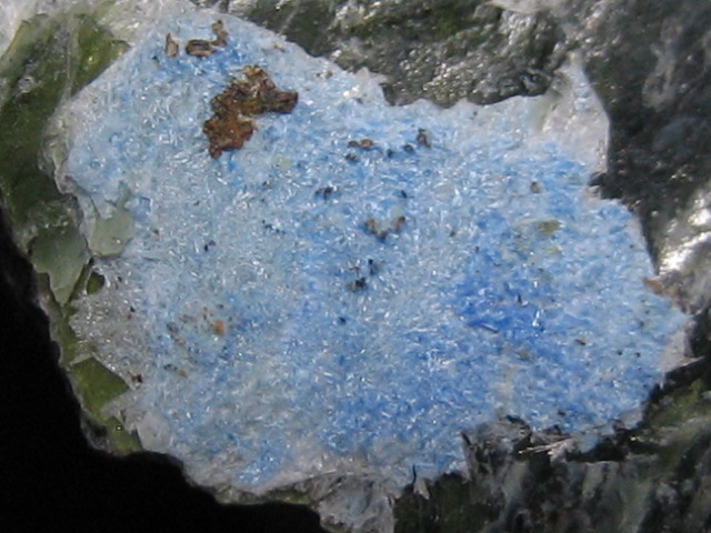 蛇紋岩の表面上に、アルチニ石と共に水色針状結晶の中宇利石が覆っています。