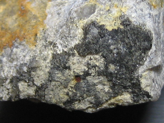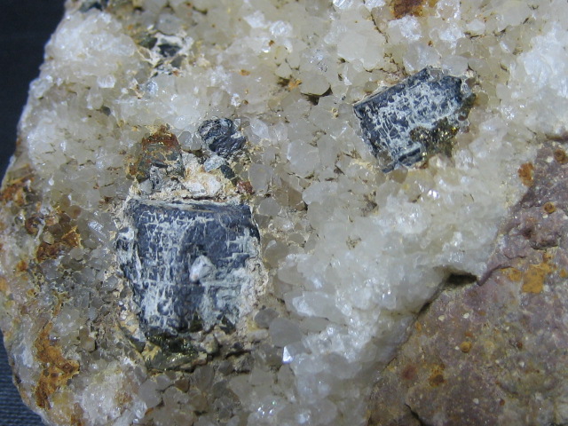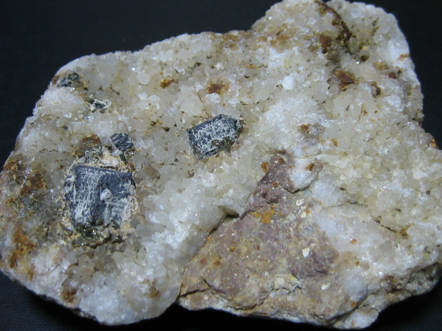 下の水晶の拡大写真です。方鉛鉱の表面は硫酸鉛鉱などの二次鉱物が付着し風化されています。