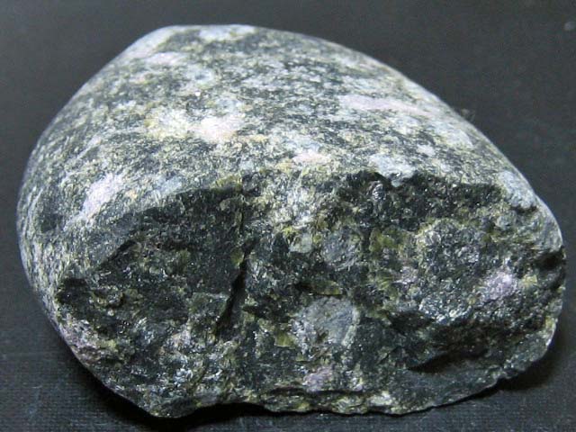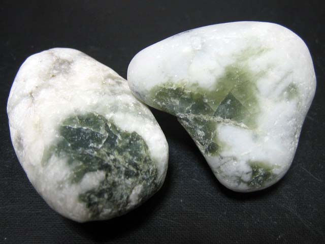 曹長石を中心に含む蛇紋岩が地下深く高圧によりヒスイになった後、蛇紋岩が削れて、曹長石やヒスイが出てきた時に、曹長石の窪みに蛇紋石が残っていたものと考えられます。蛇紋石も玉の一種として古代中国などで尊重されていました。