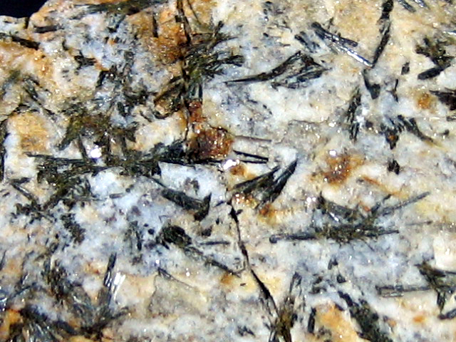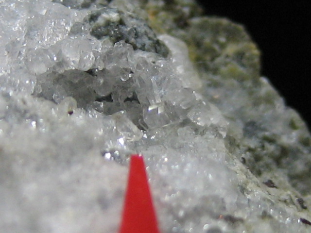 白色柱状結晶です。最初は図鑑をいろいろと見て調べましたが長い間不明の鉱物でした。しばらくして柱石?と言う意見もあり、ネットで実物の標本を購入し見比べてみると結晶形や光沢が全く同じ。やっぱりこの目で実物を見る、と言うことの大切さを実感しました。