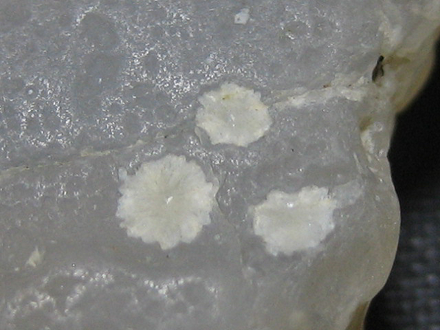 一見、玉髄上の白いしみのように見えますが、良く見ると白い放射状結晶が見られます。