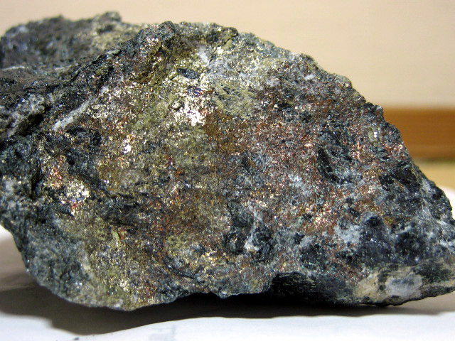 表面に黄銅鉱の小さな脈が見られる石を割ってみたら、中から本格的な班銅鉱が出て来ました。