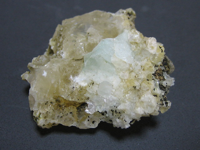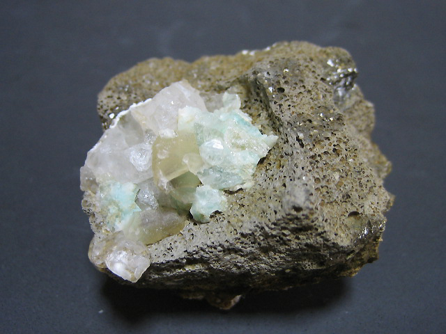 透明感の高い方解石の中に透明な青緑色魚眼石が見られます。