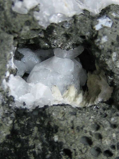 玄武岩の空隙に方沸石とトムソン沸石の板状結晶が群生しています。