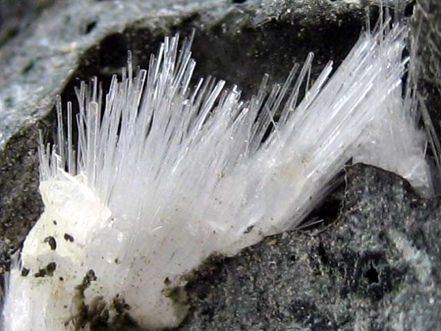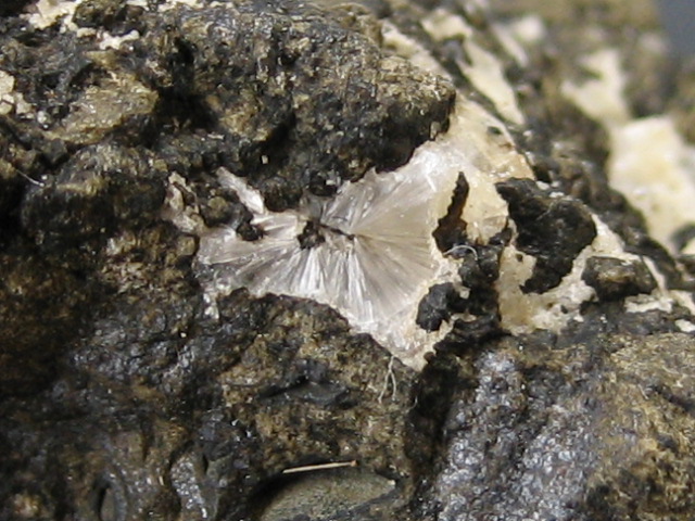 同心円状の白いガラス質の針状結晶の集合体が特徴です。新潟県間瀬で初めて発見された沸石で、ここでもなかなか見つかりません。結晶の直径4mm