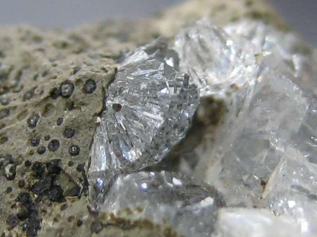 これは魚眼石のようです。結晶の上部が四角錐の形をしています。また表面がキラキラと真珠光沢を有している輝沸石も見られます。