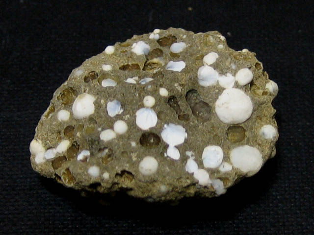 間瀬で一番沢山見られる沸石で、針状結晶の白い球状集合体が特徴的です。直径3mm。