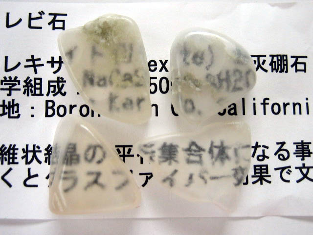 フォッサマグナミュージアムの先生に鑑定していただいたら、たぶん、ストロンチウム燐灰石でしょう、と言うことでした。