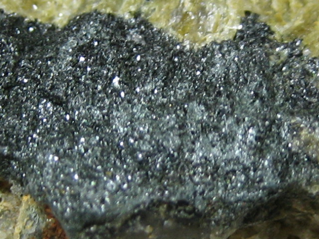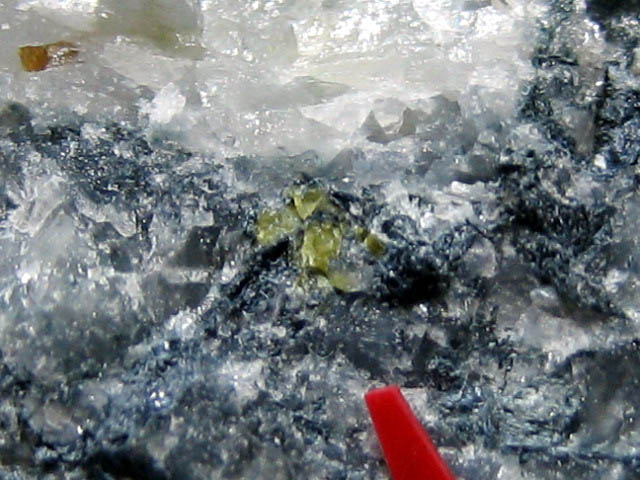 青海川で発見された新鉱物です。黄色の結晶。あまりの小ささと色の薄さのため、肉眼ではまったく見えません。
