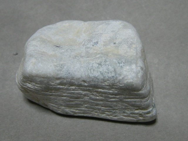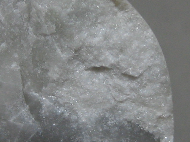 このロディン岩の表面には針状結晶のソーダ沸石が沢山付いています。ロディン岩は透輝石、単斜灰簾石、ぶどう石、(ベスブ石)などのカルシウムを含む鉱物から成り立っているので、ナトリウムを含むソーダ沸石が見られることが奇異に感じられたのですが、副成分としてソーダ沸石が含まれることもあるようです。